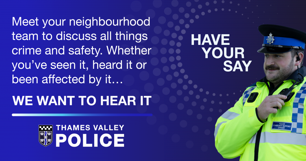 Please come along to Pitstone Pavilion between 6.30pm and 7.30pm on Thursday 29 January 2026 to speak to the local Thames Valley Police team to discuss any concerns you may have regarding crime and safety.