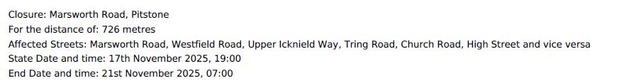 Cheddington Road, Pitstone (Thursday 3 to Friday 4 April)
